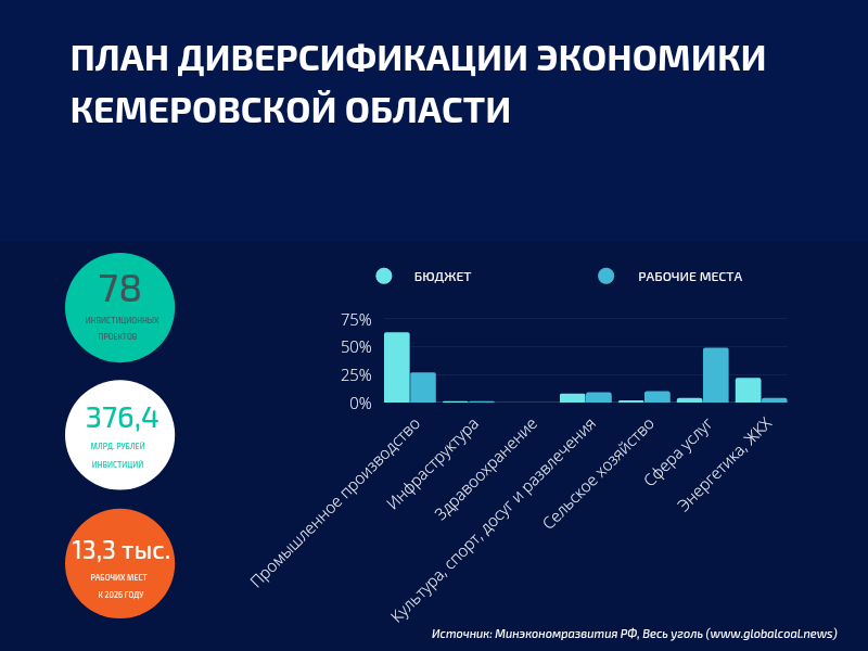 В Кузбассе, указывает ведомство, результатами плана диверсификации должны к 2026 году стать более 13 тыс. новых рабочих мест и около 400 млрд рублей внебюджетных инвестиций, привлеченных в отрасли, не связанные с добычей угля.