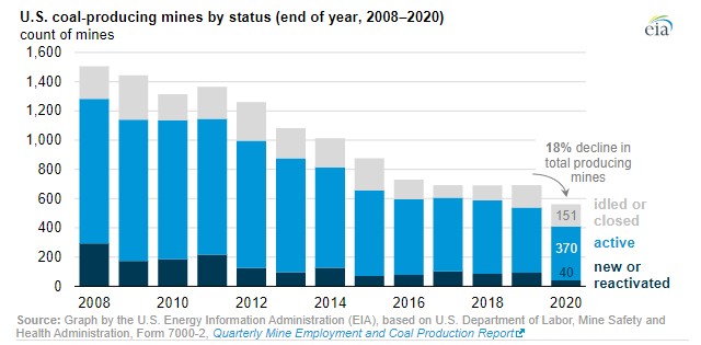 Управление по энергетической информации Министерства энергетики США сообщает, что количество действующих угольных предприятий в США сократилось в 2020 году на 18%.