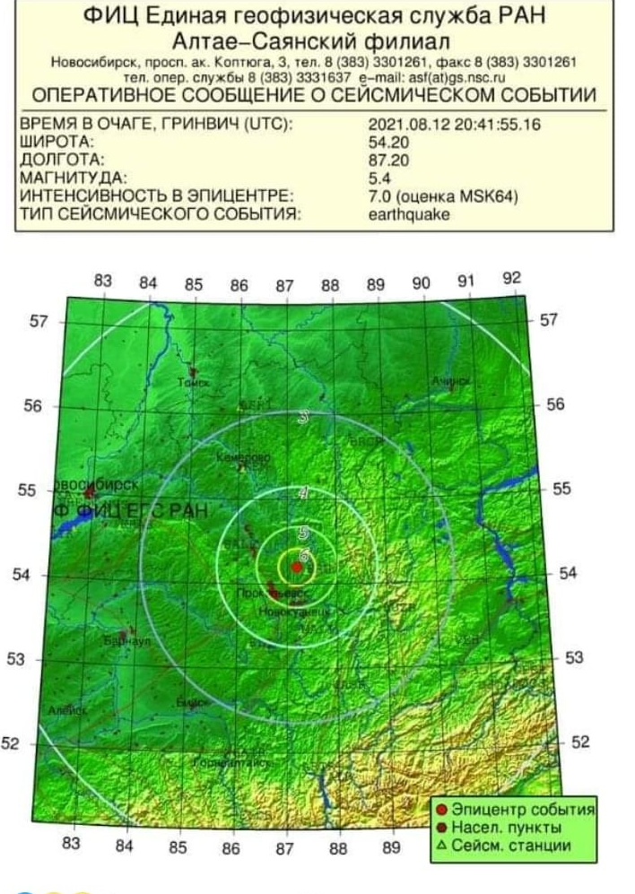 Издание Тайга.инфо, опубликовав 13 августа материал о землетрясении, сообщило, что сильные толчки, судя по постам в соцсетях, ощутили жители и Новокузнецка, и Прокопьевска.