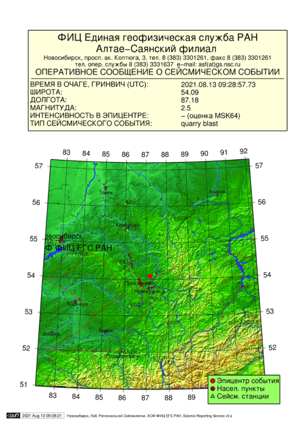 Землетрясение, по сообщению Алтае-Саянского филиала Геофизической службы РАН, произошло 13 августа в 03:41 местного времени на границе Новокузнецкого и Прокопьевского районов Кемеровской области, недалеко от деревни Большая Талда. Интенсивность толчков на поверхности земли в эпицентре составила 7 баллов, магнитуда в эпицентре – 5,4.