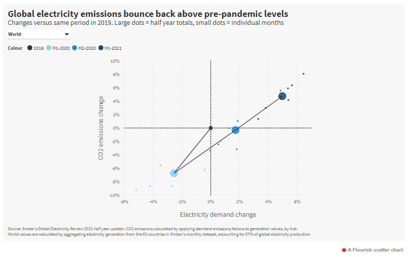Мировой спрос на электроэнергию вырос на 5% в первой половине 2021 года по сравнению с тем же периодом 2019 года – и вызвал такой же рост выбросов парниковых газов, согласно данным исследовательского центра в области климатической политики Ember.