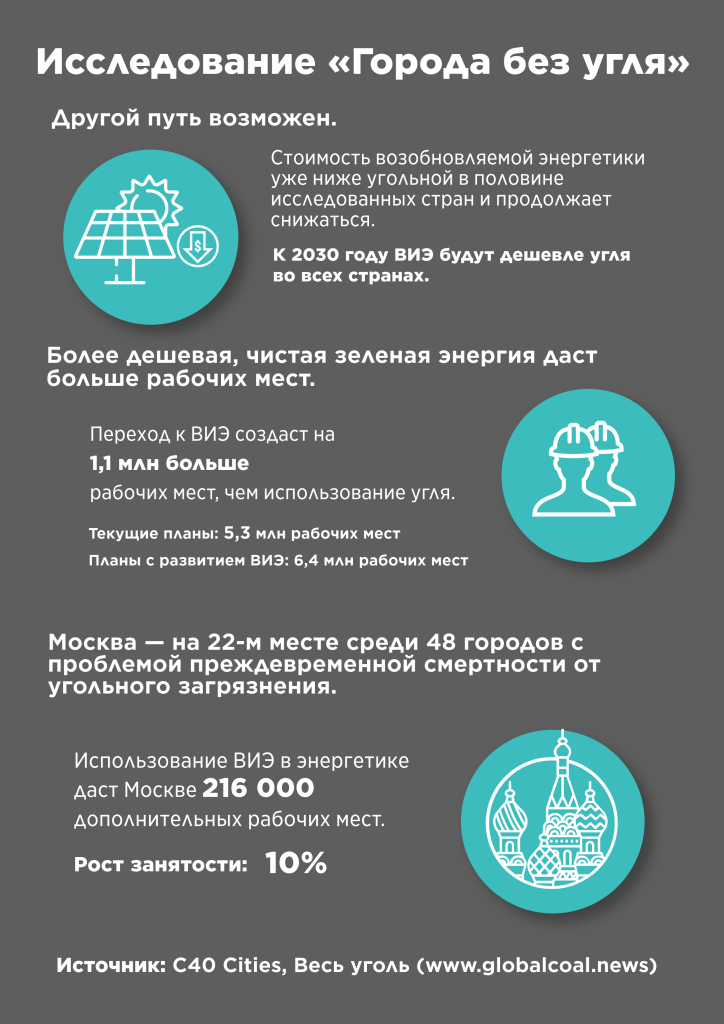 • «Города могут обеспечить зеленое, справедливое и процветающее будущее, отказавшись от угля и заменив его возобновляемыми технологиями с нулевым выбросом углерода». До 2030 года ВИЭ могут создать 6,4 млн рабочих мест – на 1,1 млн больше, чем в текущих планах с использованием угля. Прирост занятости возможен в каждом из исследованных городов – даже в странах с высоким потреблением угля, пишут исследователи. В США, по данным доклада, переход на возобновляемую энергию может привести к увеличению количества рабочих мест на 10–27%, в Китае – на 10–20%. В результате экологизации городского энергоснабжения в Нью-Йорке может быть создано 93 тыс. рабочих мест, в Мумбаи – 249 тыс., в Стамбуле – 88 тыс., в Москве – 216 тыс.