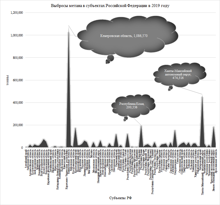 Данные федерального Росприроднадзора показывают, что по выбросам метана Кемеровская область – абсолютный лидер среди субъектов Российской Федерации: 1,1 млн тонн метана (61,7% от общего количества выброшенных в регионе загрязняющих веществ) было выброшено в Кузбассе в 2019 году. Ближайшие «конкуренты» – Ханты-Мансийский автономный округ и Республика Коми выбросили 0,5 млн тонн и 0,2 млн тонн соответственно.